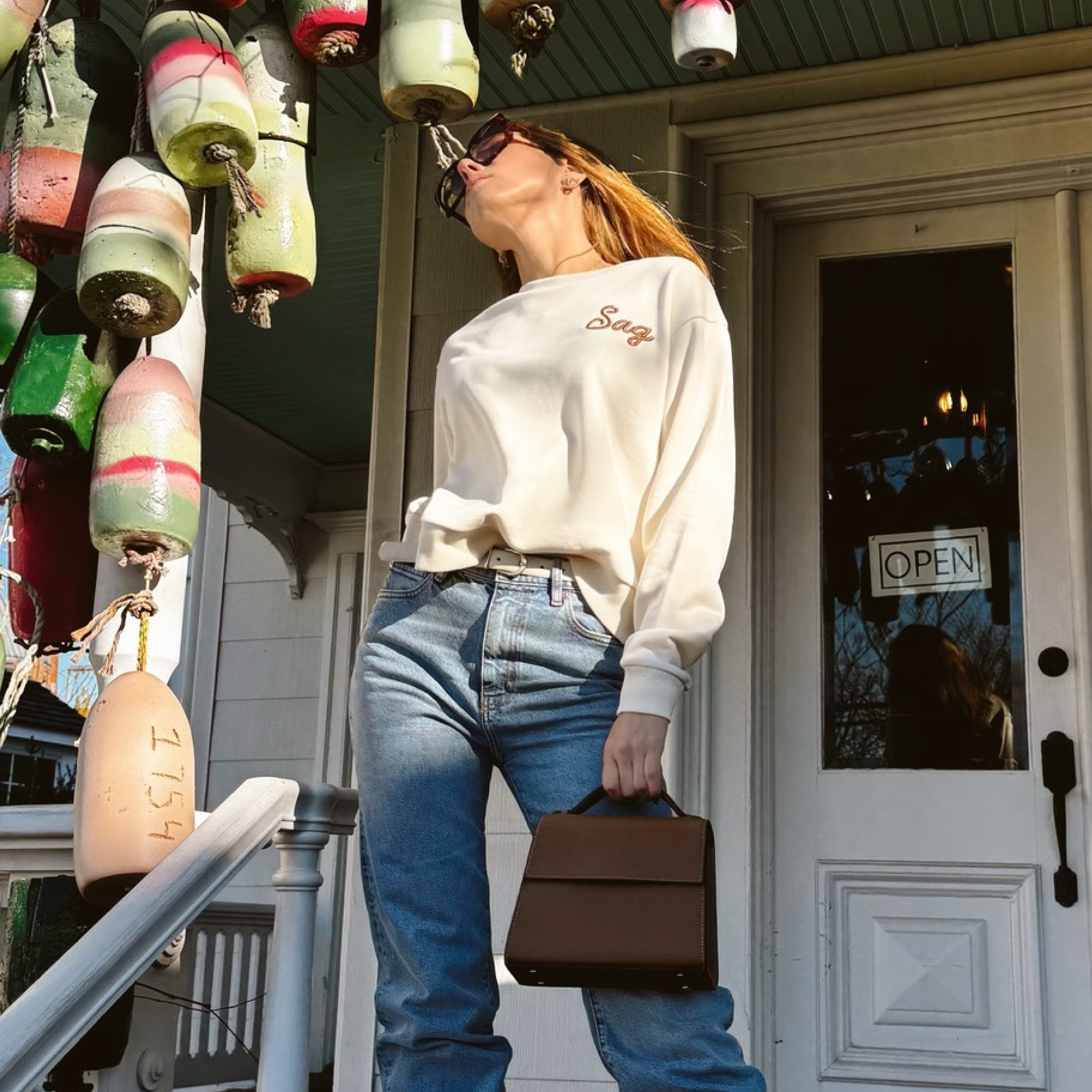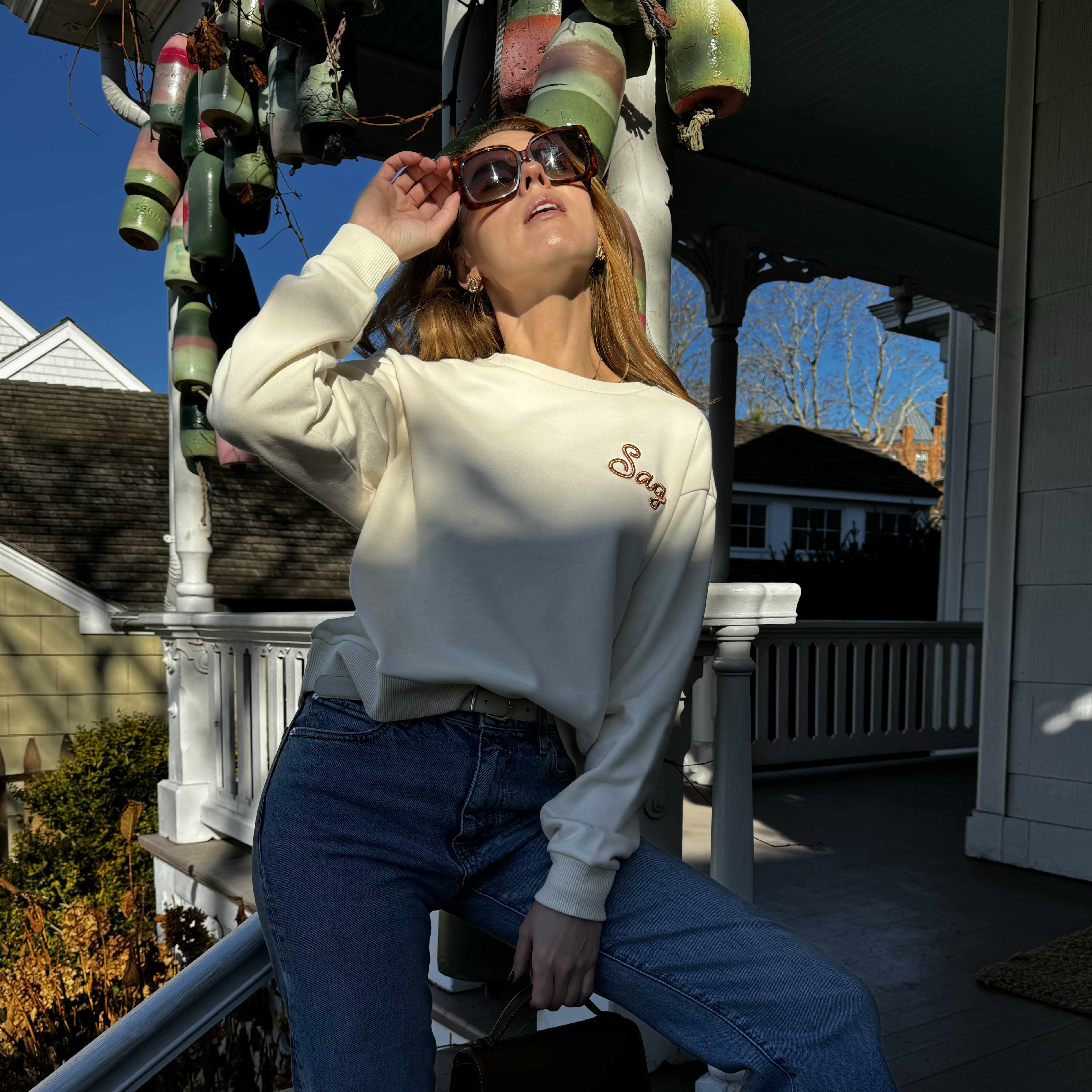 Sag Script Polished French Terry Crew White Sand Copper Embroidery